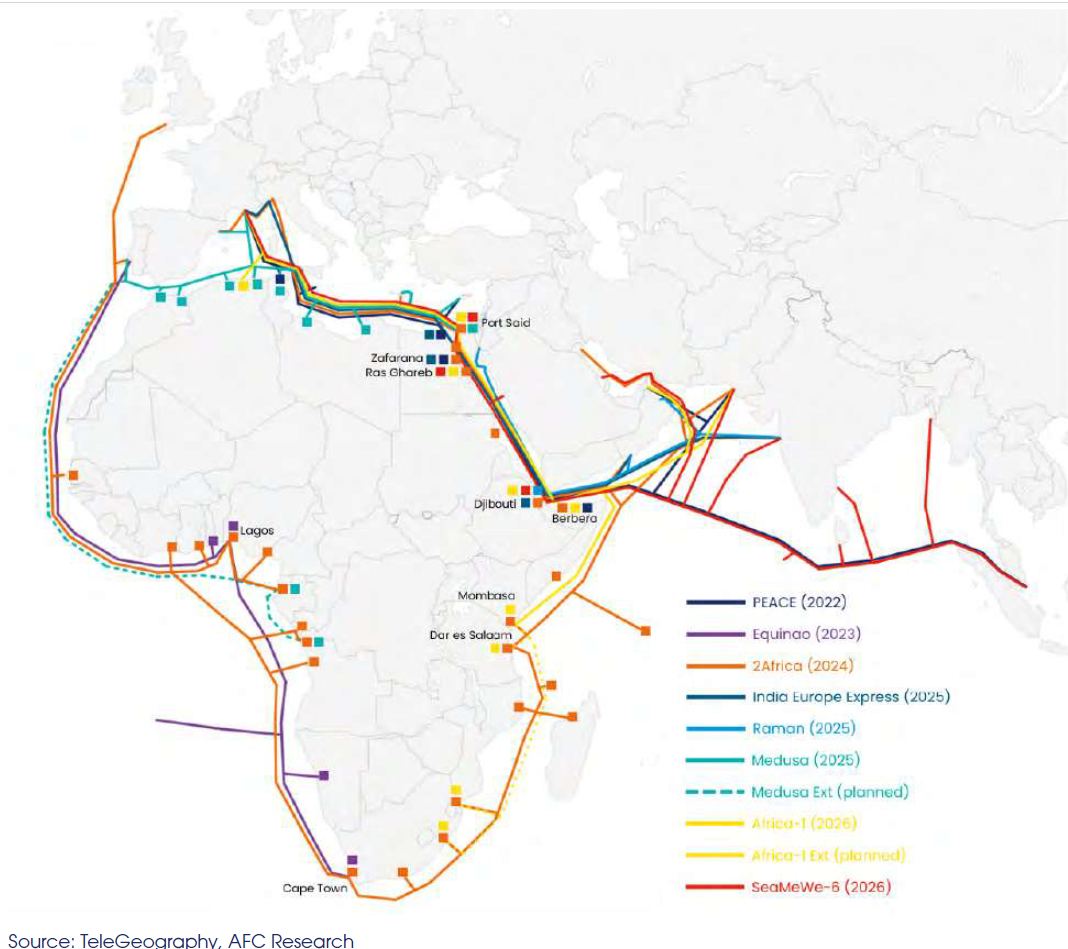 Il grafico che apre questo post elenca sommariamente i cavi sottomarini sviluppati e in corso di sviluppo in Africa dal 2022 al 2026. A ognuno di queste corrispondono cordate di investitori di diverse nazionalità. Dal cavo PEACE, che raccoglie capitali cinesi, francesi, pakistani e di diverse telco africane, ad Equinao, finanziato da Google: tutto il mondo che conta sta circondando l’Africa di cavi dati, che ovviamente favoriscono la fioritura di data center, che vedono in prima linea il Sudafrica. Ma non solo. Ci sono hub regionali emergenti, per i data center, ad esempio in Kenya, Nigeria, Egitto e Marocco. “Il Kenya ha ottenuto grandi successi in questo senso ospitando i suoi Internet exchange point all’interno di data center che ora contano i principali fornitori di contenuti (AWS, Microsoft Azure, Meta, Alphabet)