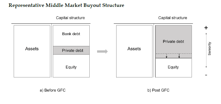 Il paper ci racconta che negli ultimi quindici anni il private debt, un tempo strategia di nicchia, è diventato uno dei pilastri dell’ecosistema finanziario globale. Dopo la Grande Crisi Finanziaria (GFC), il settore bancario ha subito una stretta regolamentare che ha ridotto la sua esposizione al credito ad alto rischio, soprattutto verso le imprese medio-piccole. Questo vuoto è stato colmato dai fondi privati, che hanno attratto capitali da investitori istituzionali alla ricerca di rendimenti più elevati in un contesto di tassi bassi. In sostanza il ruolo di intermediazione delle banche in questo segmento è stato completamente occupato dalle non banche.