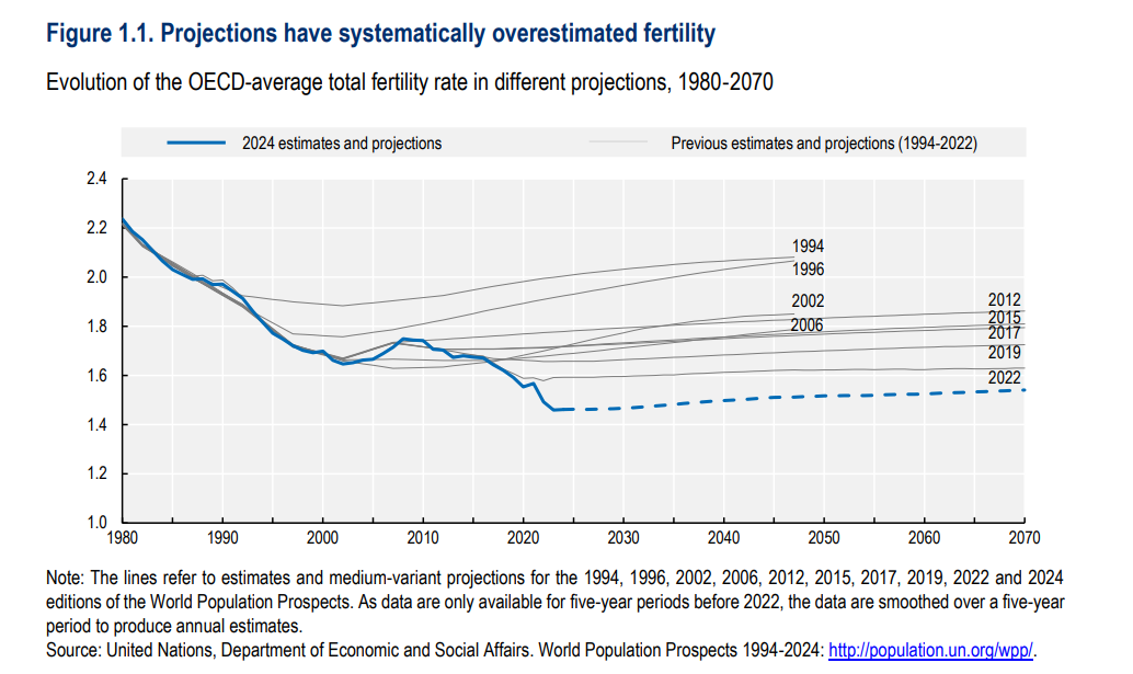 E’ interessante osservare che nel 1994 gli esperti, quindi si presume persone intelligenti, bene informate e dotate di mezzi, prevedevano che l’indice di fertilità dei paesi Ocse sarebbe rimasto stabilmente sopra il tasso di sostituzione, ossia il numero di figli necessario per mantenere l’equilibrio demografico fra nascite e morti. Ancora più interessante notare che ci credevano ancora nel 1996, e che hanno continuato a sbagliare previsioni per tutto il ventennio successivo. Non sono abbastanza intelligenti, bene informati o dotati di mezzi? Al contrario: sono sempre più intelligenti, bene informati e dotati di mezzi. Solo che non sono capaci di fare previsioni. Perché la vita è imprevedibile. Specie quando decide di non rinnovarsi.