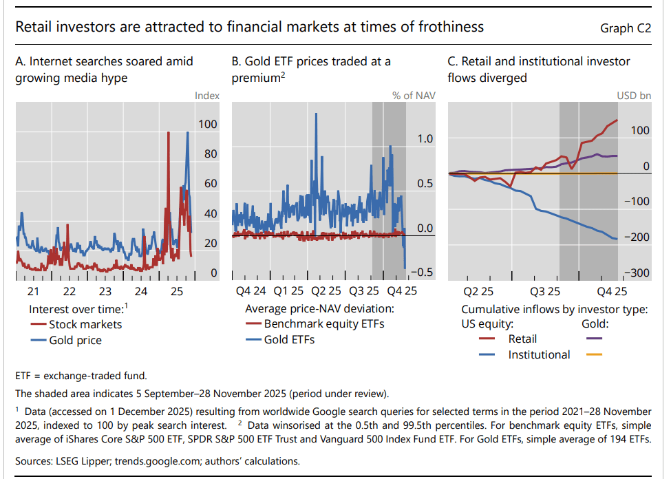 “L’entusiasmo degli investitori al dettaglio e la loro propensione per guadagni di capitale apparentemente facili si sono riversati su un tradizionale bene rifugio come l’oro”, spiega la Bis. “Dall’inizio del 2025, i prezzi degli ETF (exchange-traded fund) sull’oro sono stati costantemente scambiati a premio rispetto al loro valore patrimoniale netto (NAV), in un contesto di crescente interesse da parte degli investitori al dettaglio”.