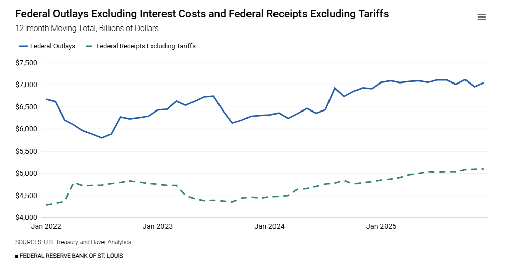 Il primo punto saliente dell’analisi riguarda il calo del deficit primario, ossia il saldo tra entrate e uscite escludendo i costi per interessi sul debito. Nell’arco dei dodici mesi precedenti a dicembre 2025, il deficit primario è diminuito di circa 350 miliardi di dollari.