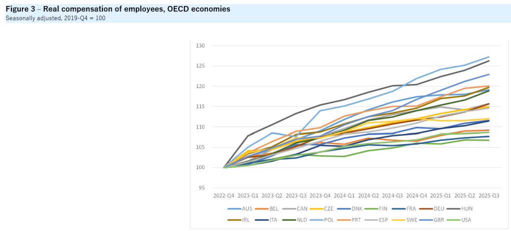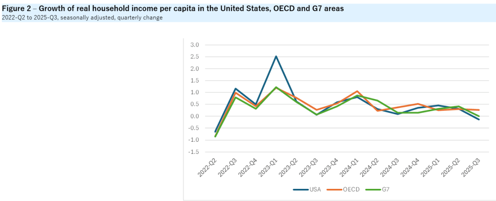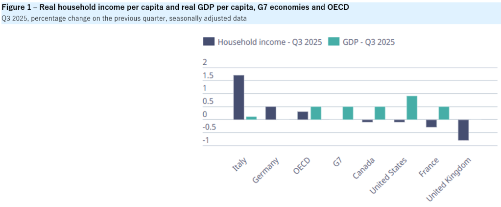 E infatti sulle venti economie osservate dall’Ocse undici hanno avuto crescita, otto hanno declinato e una è rimasta stagnante. Se stringiamo il focus ai paesi del G7, il quadro è ancora più fosco. Il Regno Unito ha osservato il calo maggiore del reddito reale (-0,8%), trainato principalmente dall’aumento delle imposte sul reddito e sul patrimonio, mentre la crescita del PIL reale pro capite è rimasta stabile (0,0%).