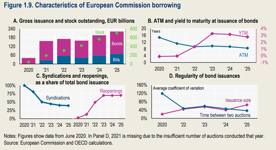 Non parliamo di grandi cifre, per il momento. Ma di grande progresso sì. Basta osservare che nel 2020 le emissioni della Commissione UE ammontavano appena a 40 miliardi e sono arrivate a 200 miliardi di euro nel 2025, moltiplicandosi quindi per cinque, cumulando uno stock che pesa 700 miliardi e si prevede raggiungerà i mille miliardi quest’anno.