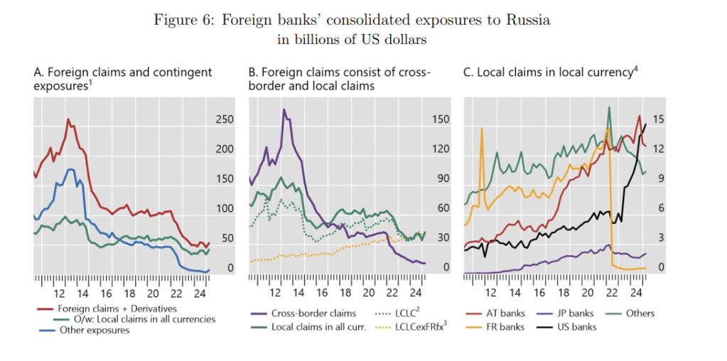 Questo fenomeno è stato osservato chiaramente nel caso della Russia. Dopo l’annessione della Crimea e soprattutto dopo l’invasione dell’Ucraina, le banche straniere hanno ridotto drasticamente il credito transfrontaliero verso la Russia. Allo stesso tempo, molte di esse hanno continuato a mantenere attività locali attraverso le proprie filiali nel paese, che operano in gran parte in valuta locale. Notate, in particolare, la notevole crescita di operazioni in valuta locale delle banche americane in Russia attraverso loro filiali.