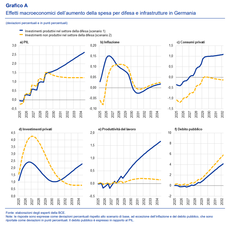 Nessuno conosce il futuro, ovviamente. E tantomeno un modello di previsione, che al limite restituisce esiti coerenti con le premesse e i dati di supporto. Però è interessante sfogliare un approfondimento che la Bce propone nel suo ultimo bollettino economico che si si interroga sull’effetto degli straordinari flussi di investimenti che la Germania ha deciso di destinare alla difesa e alle infrastrutture.