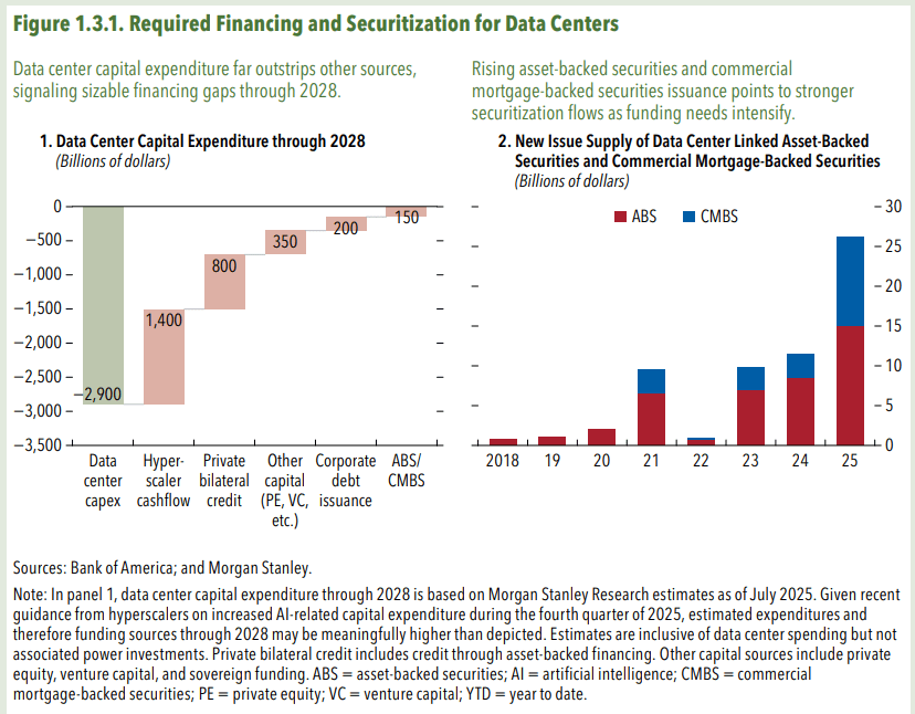In ogni caso, rimangono i fabbisogni. Il livello di investimenti richiesto, scrive il Fmi “è ben oltre il cash flow degli hyperscalers (i grandi soggetti hi tech che agiscono nel mercato, ndr) e la loro capacità di emissione”. Si stanno sviluppando forme di securization, ma siamo ancora livelli non sufficienti a colmare il notevole funding gap (vedi grafico sopra a sinistra).