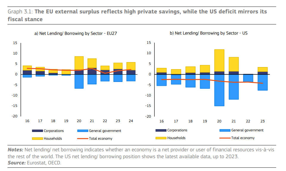 Questi risparmi vengono principalmente convogliati in investimenti diretti esteri, azioni e obbligazioni. “Dal 2020 – scrive l’Ue -, gli Stati Uniti sono la principale destinazione di questi fondi, in termini netti”. I risparmi europei svolgono un ruolo molto importante nel soddisfare la domanda globale di capitali, ma ancora di più lo svolgono per gli Stati Uniti, la cui “fame” di prestiti sembra insaziabile. Il deficit del governo, in particolare, è la principale voce che alimenta la domanda di prestiti Usa. Alla fine del 2023 il deficit complessivo dell’economia Usa era intorno al 5% del pil e non si intravedono segnali di inversioni di rotta.