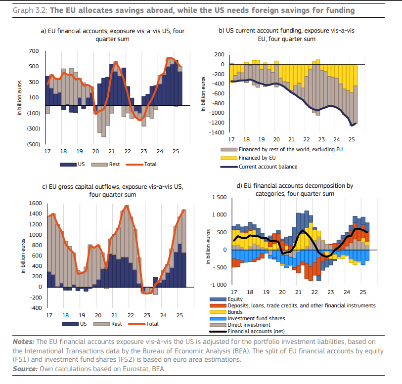 Tanto è vero che nel 2024, secondo i dati diffusi dall’Ue nel suo ultimo European Macroeconomic Report, l’Ue ha destinato 437 miliardi dei suoi ingenti risparmi proprio agli Stati Uniti, superando di gran lunga la media storia di circa 300 miliardi l’anno che risale almeno dal 2015.