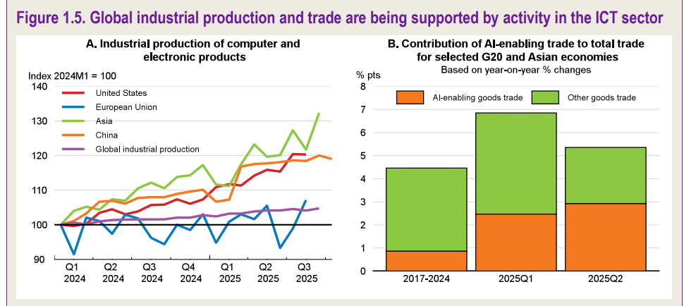 Il grafico sopra ci comunica un’altra informazione importante. “Il commercio in molte economie asiatiche è inoltre sostenuto da un forte aumento del commercio basato sull’intelligenza artificiale, legato alla rapida crescita degli investimenti in apparecchiature ICT negli Stati Uniti e in alcune altre economie”. Così la spiega Ocse.