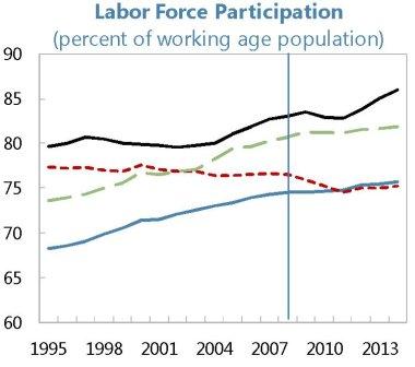 Partecipazione forza lavoro nell’EZ, in Giappone e negli Usa