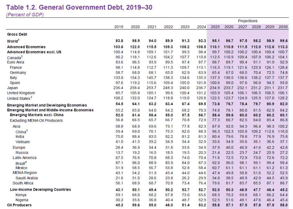 Giusto per la cronaca, vale la pena ricordare in conclusione che i grandi sponsor della crescita globale del debito pubblico, che è visto a quota 100% del pil entro il 2030, sono Brasile, Cina, Francia Sud Africa Regno Unito e, dulcis in fundo, gli Usa. E questa previsione non tiene conto del caos potenziale che può generare una crisi commerciale internazionale, che a questo punto bisogna augurarsi non accada. Per una semplice ragione: i governi non se la possono permettere.
