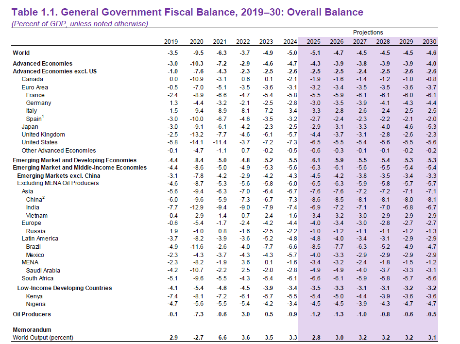 La rappresentazione che ne dà il Fmi nel suo ultimo Fiscal monitor non è molto rassicurante. I fattori che stanno alla base di questa crescita, che si associa per giunta alla rallentamento della crescita del pil che dovrebbe essere la panacea di quella del debito pubblico, sono ormai strutturali. Da una parte i governi continuano – tutti – a spendere più di quello che incassano dalle tasse. Il deficit globale, infatti, è cresciuto dello 0,1% nel 2024, che sembra poco ma non lo è, visto che il rapporto deficit/pil globale è arrivato al 5%, con paesi più o meno virtuosi. Notate (tabella sotto) che Usa e Cina hanno raggiunto lo stesso livello di deficit nel 2024.