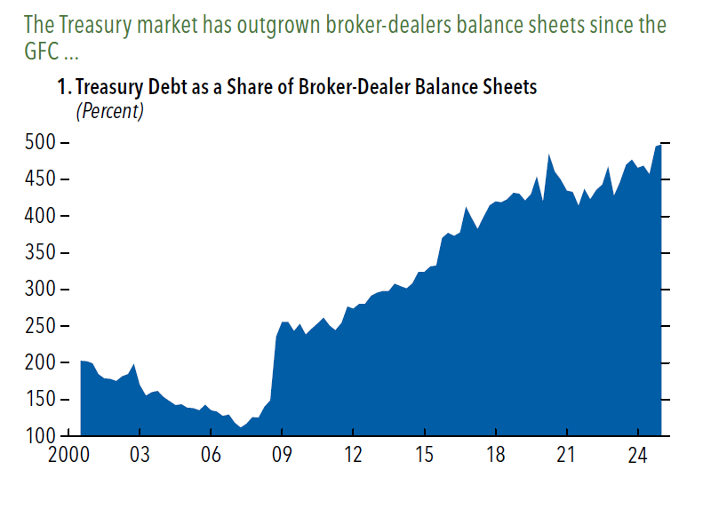 Che significa? Molto semplice: il mercato dei titoli di stato usa in circolazione, i Treasury, ha raggiunto in valore il 500% del totale dei bilanci dei principali broker-dealer, ossia i grandi mercanti di questi titoli, che in sostanza sono chiamati a sostenerlo.