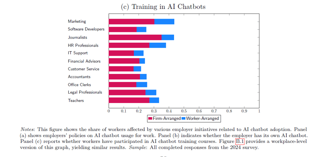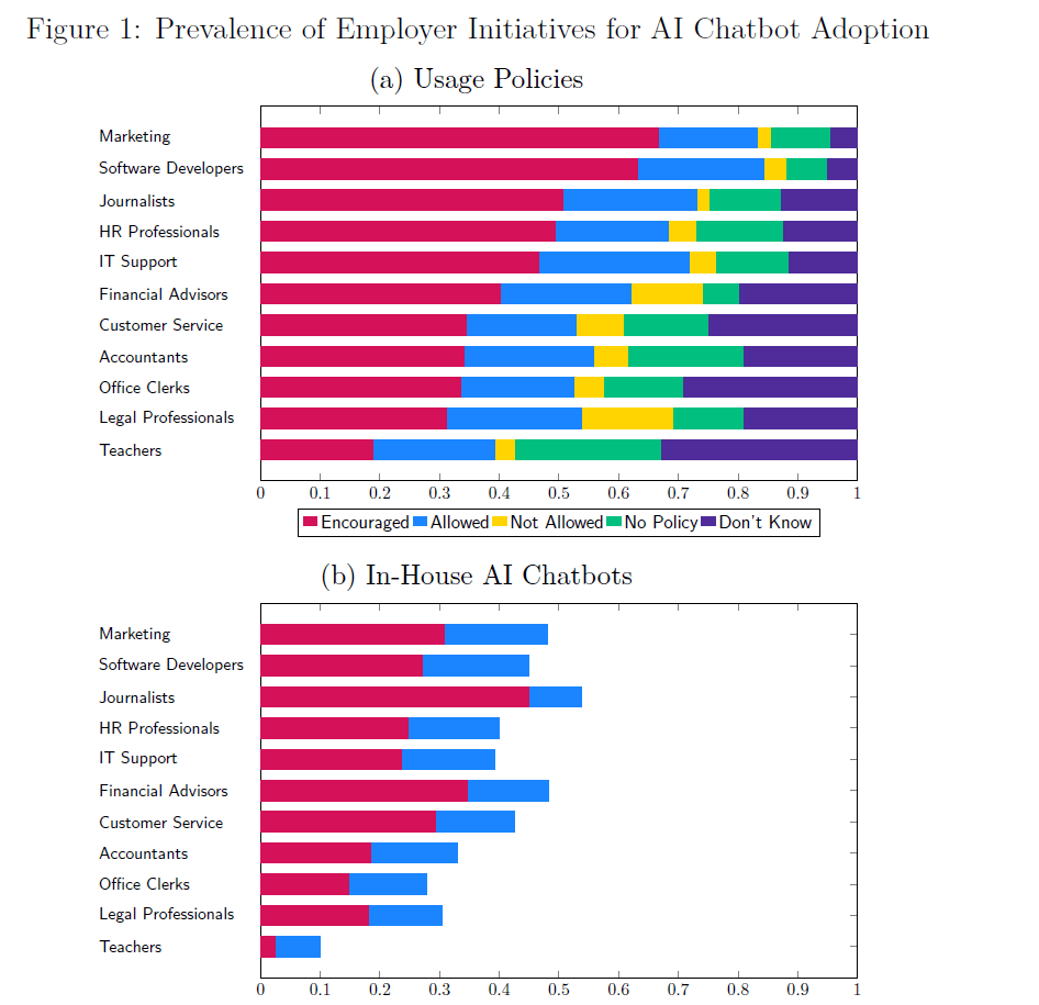 I ricercatori documentano che l’adozione è rapida: oltre l’80% degli utenti in aziende che ne incoraggiano l’uso. Le imprese investono in modelli proprietari, organizzano corsi, ridefiniscono mansioni. L’adozione non è solo bottom-up: è sempre più pilotata dall’alto, con effetti positivi su equità e diffusione. Le differenze di genere e anzianità, ad esempio, si riducono significativamente nei contesti in cui i datori di lavoro promuovono attivamente gli strumenti.