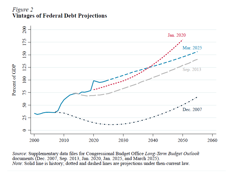 E’ proprio il 2007 l’anno in cui tutto cambiò. L’anno in cui si conclamò la crisi subprime, nel caso l’aveste dimenticata. E la cosa interessante è che nessuno poteva immaginare quanto sarebbe cambiata. Ce ne possiamo fare un’idea confrontando le proiezioni di quello anno sull’andamento del debito con quelle di sei anni dopo.
