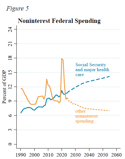 La spesa per la social security Usa e i programmi sanitari era l’8% del pil 30 anni fa, è arrivata all’11% nel 2025 ed è prevista al 14% fra trent’anni. Per avere un’idea di quanto pesi in termini assoluti, basta rilevare che i vari programmi che rientrano in questa voce di spesa pesano già più della metà di tutte le spese federali esclusa quella per interessi.