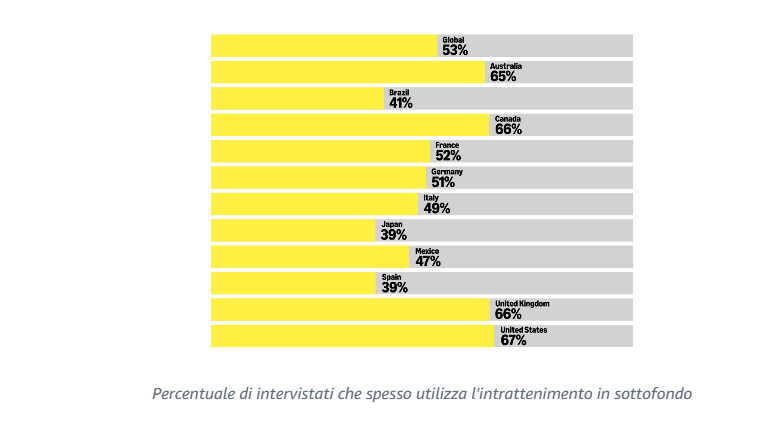 Come ultima notazione interessante da condividere, c’è anche l’informazione che “più della metà degli intervistati concorda sul fatto di utilizzare spesso alcune forme di intrattenimento in sottofondo e questa percentuale sale a circa i due terzi nei paesi prevalentemente anglofoni”.