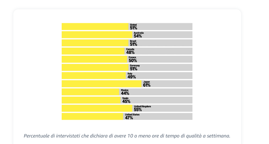 La ricerca mostra che c’è un 41% di consumatori, ossia i 17.600 intervistati di età compresa fra i 18 e i 74 anni, che considerano le proprie settimane alquanto stressanti. Più della metà del campione, diffuso globalmente, dice di aver meno di dieci ore di tempo di qualità a settimana.