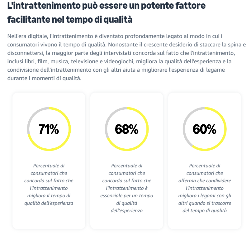 Il binomio tempo libero e intrattenimento è il cuore dell’articolo pubblicato da Amazon, e scorrere la ricerca che lo ha ispirato ci comunica altre informazioni interessanti sulle opinioni dei consumatori.