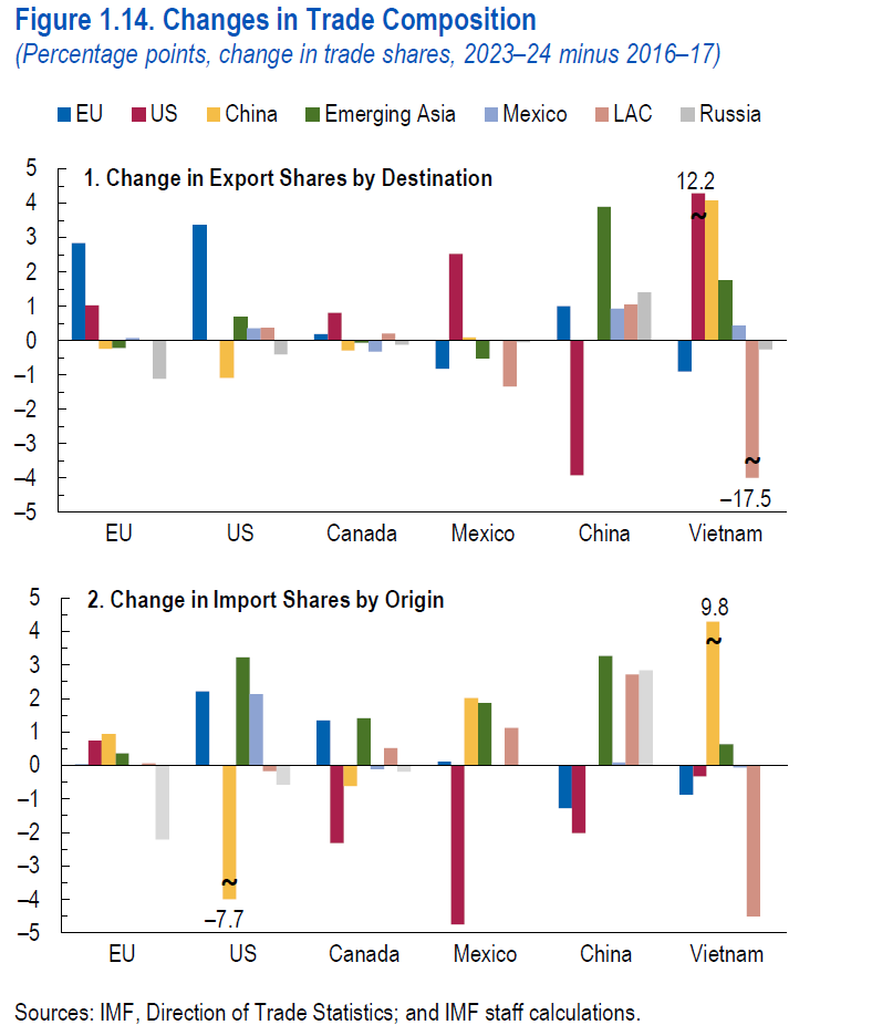 I dati contenuti nell’ultimo WEO del Fmi mostrano questa chiara evidenza, circa le possibilità concrete dei paesi ad economia avanzata di restaurare la propria manifattura, o almeno un certo tipo di manifattura: è un’impresa molto difficile, vista la struttura economica che questi paesi hanno maturato nel frattempo, e anche sostanzialmente inutile. Difficile perché cinesi e vietnamiti sono probabilmente assai più dotati di noi di operai capaci di cucire scarpe o una borsa di lusso, e poi perché hanno un accesso privilegiato alle catene di fornitura per questi prodotti ( non solo per questi) che spesso partono proprio dai paesi avanzati.