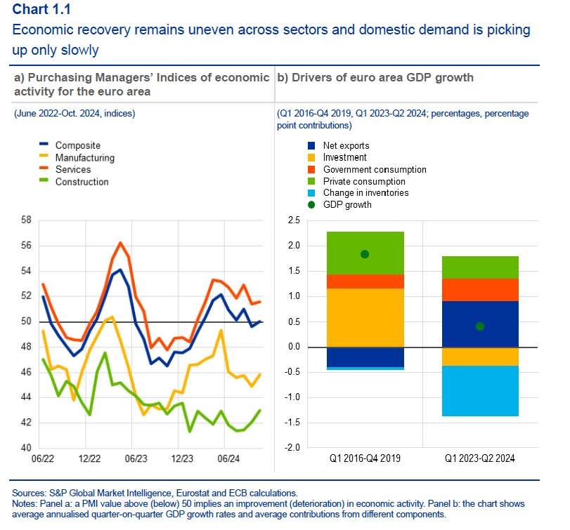 Ma a quale prezzo? Il grafico che apre questo post racconta illustra meglio di mille parole le caratteristiche dell’economia europea. Nell’ultimo anno il grosso della crescita è arrivato dall’export netto, componente tradizionale del pil europeo, ma estremamente problematica in un contesto di commercio internazionale sempre più complicato e di fronte a una prospettiva di dazi in arrivo dagli Usa che rischiano di replicare il copione già visto nella prima presidenza Trump. Notate che l’export netto ha contribuito negativamente alla crescita fra il 2016 e il 2019, gli anni in cui Trump era alla Casa bianca.