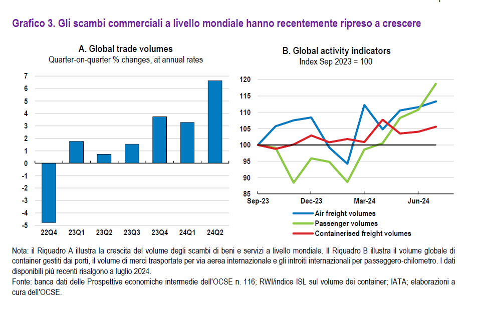 Il confronto, molto eloquente, fra l’andamento dei volumi del commercio internazionale negli ultimi trimestri ci comunica una informazione che non dovremmo sottovalutare. Nel secondo quarto di quest’anno, mentre infuriavano guerre e se ne minacciavano altre, c’è stato un piccolo boom negli scambi internazionali, che forse dovrebbe suggerirci di riscrivere la narrativa sulla deglobalizzazione che ci tiene compagnia ormai da un lustro. Forse si è trattato di un evento stagionale, magari determinato da un flusso di ordinativi che si è impennato per motivi imponderabili, oppure forse il commercio, a patto di non strozzarlo esplicitamente – vedi Covid – trova sempre la sua strada, in un mondo costantemente affamato di tutto. Rimane il fatto e non è poco, specie considerando che nel frattempo i costi del trasporto via container rimangono superiori del 160 per cento rispetto a un anno fa, con aumenti ancora maggiori nelle rotte fra Asia ed Europa. Caro commercio, in tutti i sensi.