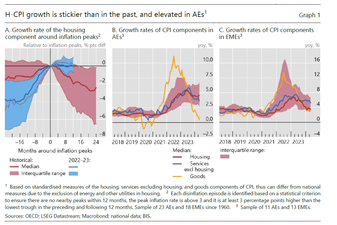 La Bis di Basilea ne ha parlato in un bollettino dove si osserva (grafico sopra al centro) che la componente immobiliare nell’indice inflazionistico (H-CPI) ha persino superato, dopo averla costeggiata a lungo, la componente dei servizi, finora la grande indiziata del trend ancora elevato del carovita. Questa tendenza è maggiormente visibile nei paesi avanzati, al contrario di quanto si è osservato nei paesi emergenti, dove d’altronde le crisi immobiliari hanno fatto sentire il loro peso più volte negli ultimi anni. Non a caso. Il costo per le abitazioni rappresenta una quota crescente delle spese delle famiglie e di conseguenza interpreta un ruolo di sempre maggiore importanza nella composizione dell’indice dei prezzi.