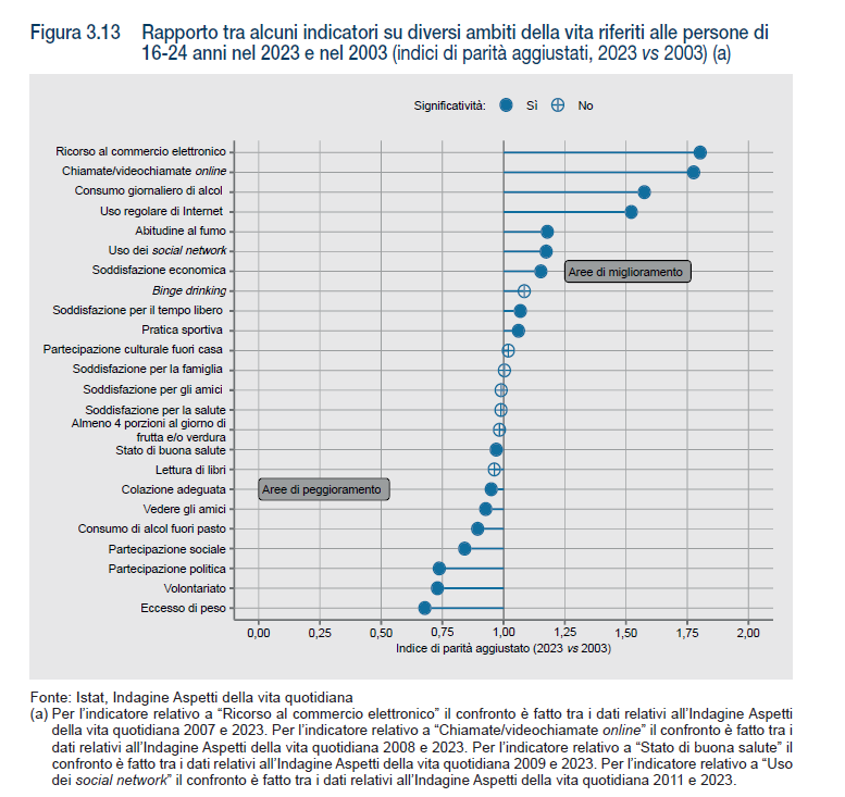Guardo e riguardo la tabella che Istat ha compilato osservando lo stile di vita dei nostri giovani, i nostri nativi digitali. Li scopro più a rischio di eccesso di peso, più votati al consumo occasionale di alcol, sempre meno interessati alla vita sociale e politica. Sono forti con i computer – e vorrei vedere – e ormai comprano molte cose on line, stanno parecchio sui social ma non mangiano benissimo: meno del 15 per cento mangia le canoniche quattro porzioni di frutta e verdura raccomandate dai medici, pure se si è ridotto il consumo di bevande gassate, e fanno colazioni alquanto povere. Molti non la fanno proprio. In compenso si fuma di meno. Almeno le sigarette di tabacco, Perché dal 2020 si è diffuso l’utilizzo di sigarette elettroniche. Fanno anche un po’ più di sport con continuità, rispetto ai giovani di vent’anni fa e si ritengono più soddisfatti. Nel 2023 oltre la metà di loro esprime un voto fra 8 e 10 per la vita nel suo complesso. Bisogna capirli. Saranno pure digitali. Ma rimangono giovani.