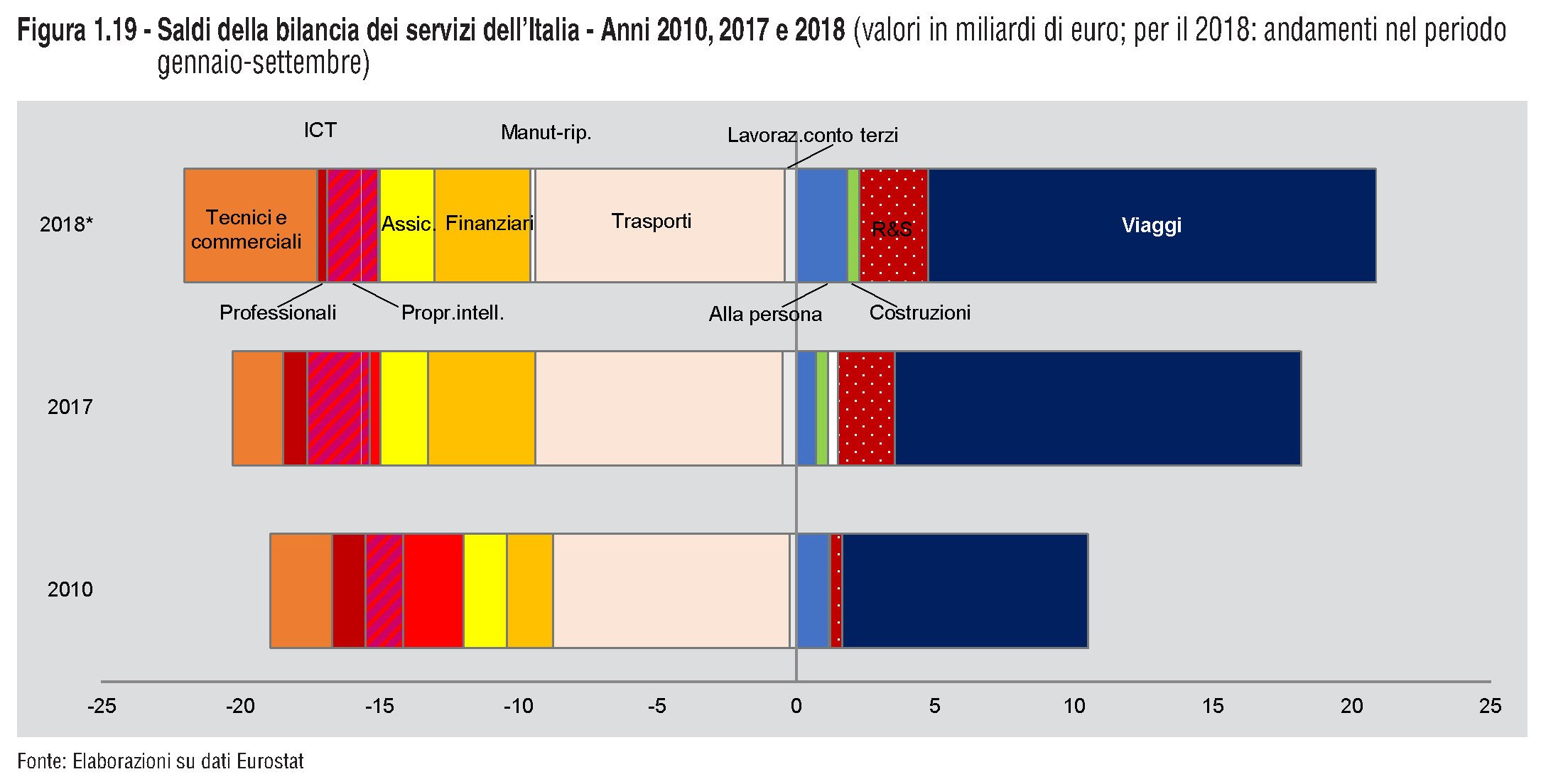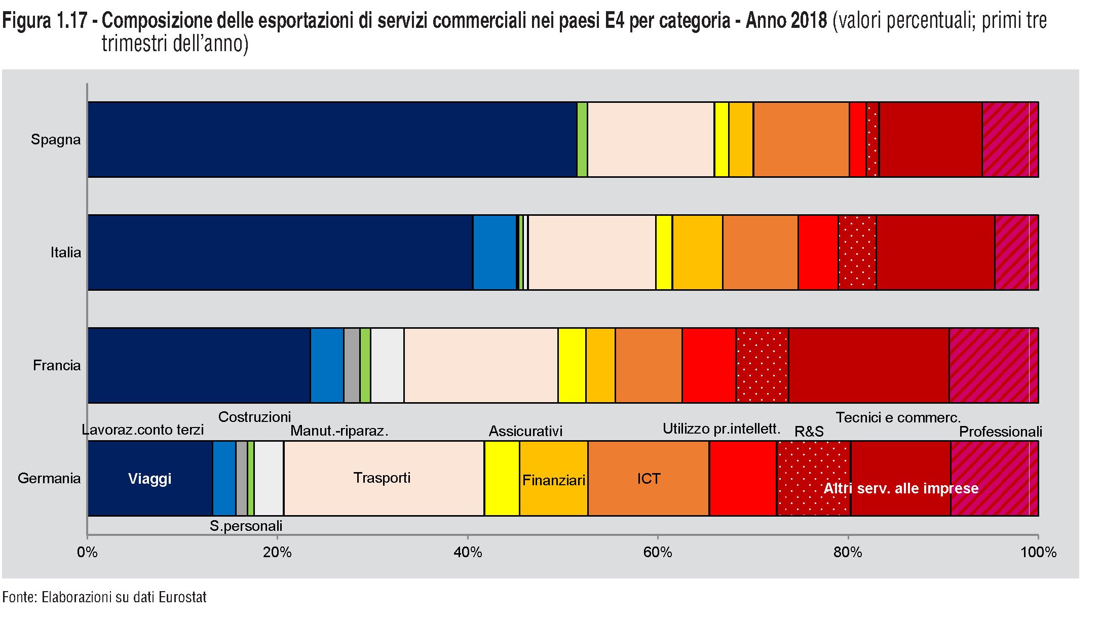 di viaggio e una scarsa rilevanza delle attività a maggior contenuto di conoscenza, quelle cioè ricomprese negli altri servizi alle imprese”. Sono pure poco sviluppate le vendite estere di servizi “a media intensità di conoscenza come i trasporti e la logistica, i servizi di manutenzione e riparazione (tipicamente associati alla vendita di impianti e strutture), i lavori di costruzione internazionale”.