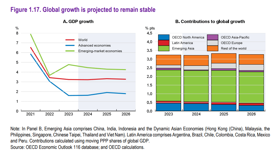 Superato l’anno nero del 2023, già dall’ultimo quarto di quell’anno il commercio ha ricominciato a crescere stabilmente, soprattutto grazie ai servizi. Le previsioni esibiscono ampi chiaroscuri, i dati sulle spedizione marittime su container continuano a crescere, ma gli andamenti degli ordini osservati nell’ultima parte dell’anno sono meno incoraggianti. E tuttavia, al netto di situazioni isolate, il totale (che fa la somma, come diceva Totò) è quasi rassicurante. La crescita del commercio è prevista piatta, che è un altro modo per dire stabile, anche se con qualche cambiamento all’interno dei paesi che la esprimono. In soldoni: la Cina perde quota a vantaggio dei paesi europei dentro Ocse,