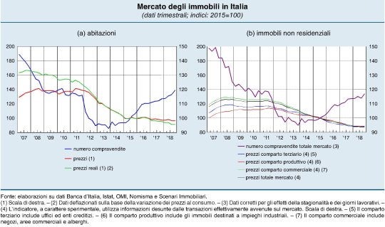 Senonché, se guardiamo il grafico di sinistra, che traccia l’andamento dei prestiti per l’acquisto di abitazioni, osserviamo che domanda e offerta si sono incontrate a un livello sostanzialmente piatto. Il mercato dei mutui ha chiuso il 2018 con un andamento vagamente stagnante che fa il paio con quello del mercato immobiliare, ancora molto lento, specie se ci confronta con quello europeo.