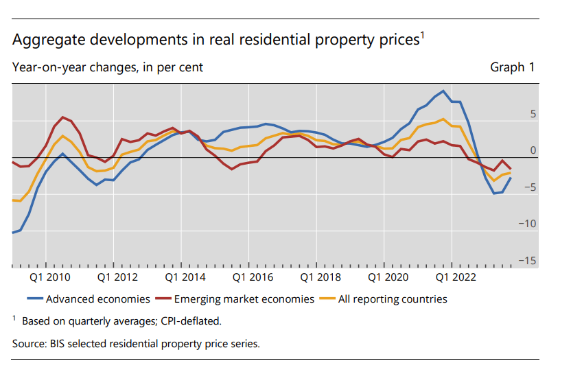 I prezzi, infatti, sono diminuiti “solo” del 2,1% su base annua nel terzo trimestre 2023, con le economie avanzate a deflazionarsi più rapidamente (-2,7%) rispetto a quelle emergenti (-1,6%) secondo quanto riportano le ultime statistiche immobiliari diffuse dalla Bis.
