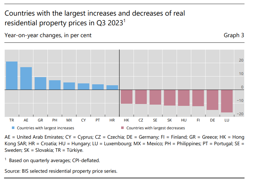 I prezzi, infatti, sono diminuiti “solo” del 2,1% su base annua nel terzo trimestre 2023, con le economie avanzate a deflazionarsi più rapidamente (-2,7%) rispetto a quelle emergenti (-1,6%) secondo quanto riportano le ultime statistiche immobiliari diffuse dalla Bis.
