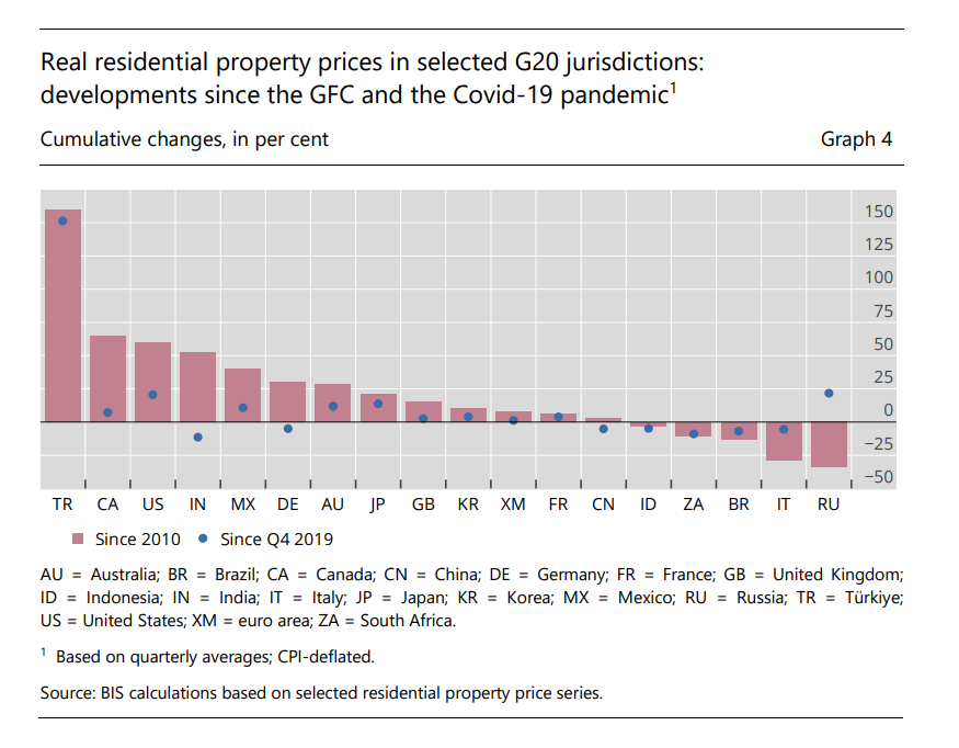 Se allunghiamo l’orizzonte dell’osservazione, retrocedendo fino al periodo fra il 2010 e il 2019 (dopo crisi subprime e prima di crisi Covid), si possono apprezzare le notevole differenze fra i diversi andamenti nei singoli paesi del G20, che rendono poco informativo, a ben vedere, l’indice globale dei prezzi.