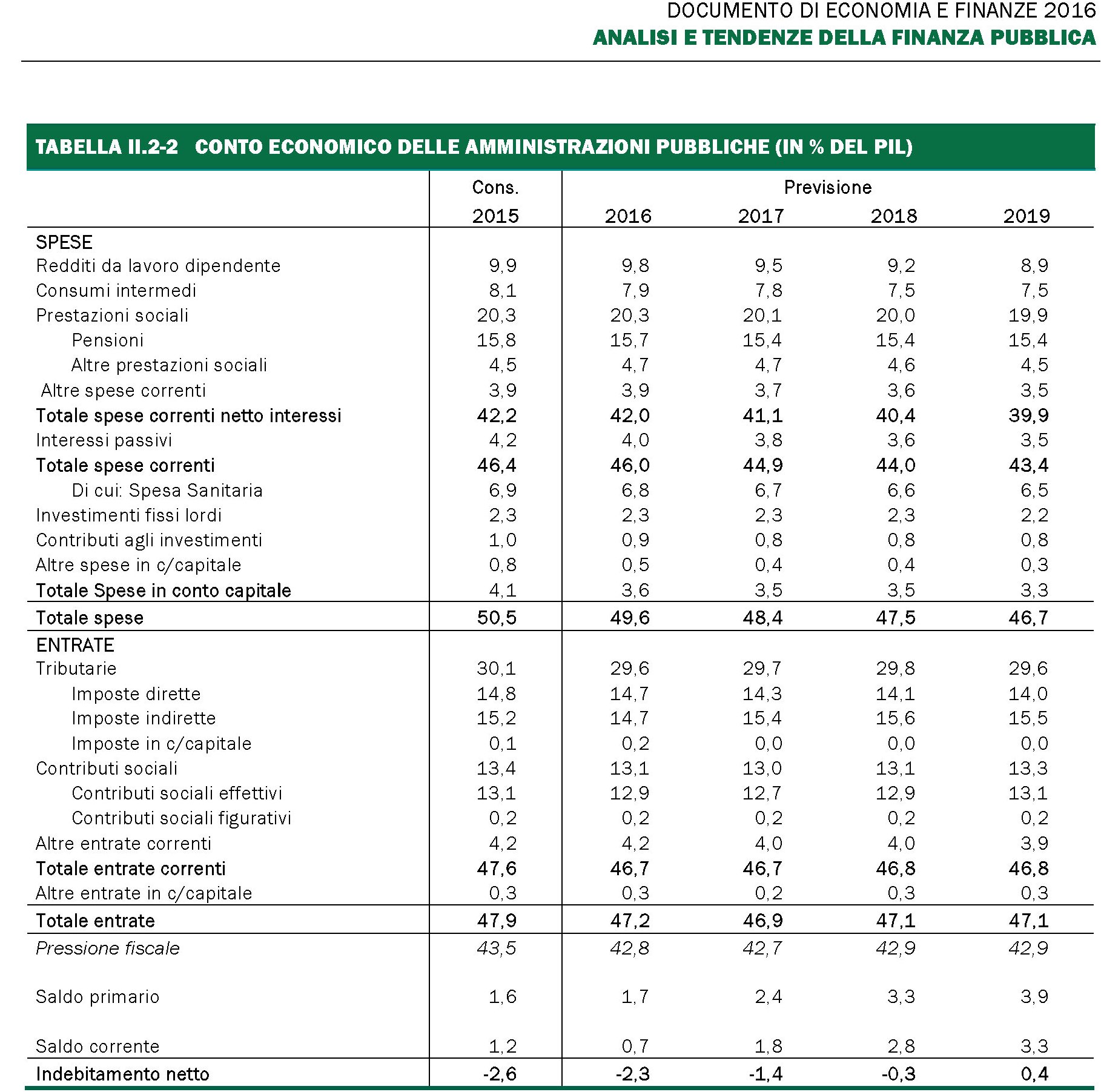 Cominciamo dai dati 2015. L’anno scorso l’indebitamento netto, ossia il deficit, è diminuito dello 0,4% del Pil, portandosi al 2,6. Questa diminuzione corrisponde proprio al calo registrato sulla spesa per interessi, passata dal 4,6% del Pil del 2014 al 4,2, mentre l’avanzo primario è rimasto stabile all’1,6%. Ricordo che l’avanzo primario misura il saldo fra entrate e spese al netto della spesa per gli interessi. Ciò in pratica vuol dire che è rimasto stabile il rapporto fra entrate e spese, che detta così spiega poco.