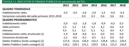 Qui leggo che nel 2015 il deficit rimarrà inchiodato al 2,9%, con un saldo primario ancora in calo all’1,6%, quando ad aprile lo stesso quadro ipotizzava un deficit in calo all’1,8% e un saldo primario del 3,3%, malgrado una spesa per interessi prevista al 5,1% del pil a fronte del 4,5 di settembre.