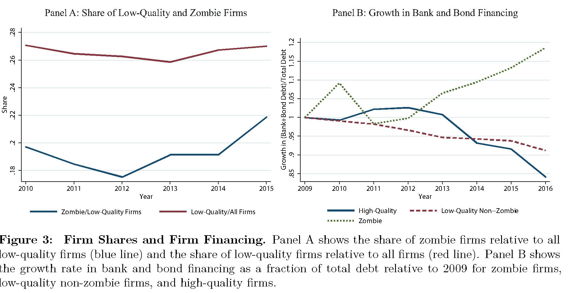 In sostanza a partire dal 2012 è aumentata la quota di imprese zombie sul totale di imprese poco efficienti, mentre queste ultime sono leggermente cresciute rispetto al totale delle imprese. Al tempo stesso è aumentata significativamente la quota di credito che le banche hanno destinato alle imprese zombie, a differenza di quanto accaduto a quelle di alta qualità. Comportamento comprensibile: le banche hanno potuto usare il credito a basso costo innanzitutto per salvare le aziende verso le quali erano probabilmente più esposte. Ma poiché le risorse non sono illimitate, ciò ha comportato che le imprese più efficienti hanno avuto meno accesso a risorse. Ed ecco spiegato perché ne abbia risentito la produttività.