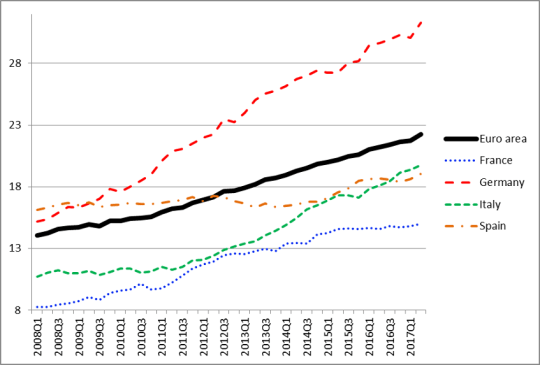 Se guardiamo al problema dal lato dei flussi commerciali, si osserva che l’apertura internazionale dell’eurozona, al netto di qualche saliscendi, è aumentata notevolmente nell’ultimo quarto di secolo, persino più del resto del mondo.