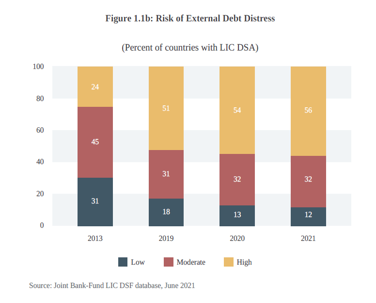 Il grafico sopra mostra come fra il 2010 e il 2020 la mediana del debito pubblico fra i paesi censiti dalle agenzie della Banca Mondiale è cresciuta fra il 35 e il 50%. Nella metà di questi paesi, che hanno potuto godere di un certo alleggerimento dei debiti grazie alla Heavily Indebted Poor Countries initiative (HIPC), l’interest-to-revenue ratio sul debito estero, ossia il rapporto fra il costo del servizio del debito estero rispetto alle entrate, è peggiorato rispetto a quella precedente all’intervento. In parte a causa della caduta dei prezzi delle commodity, registrata fra il 2011 e il 2014, in parte per l’aumento dei tassi reali. Insomma: per i paesi poveri vale il contrario di quel che vale nei paesi ricchi, dove i tassi reali in molti casi negativi hanno alleggerito il peso del debito. Piove sempre sul bagnato, per ricordare un altro proverbio. E questo spiega perché siano raddoppiati i paesi giudicati a rischio. Il che ovviamente, peggiorando il loro merito di credito, attiva un terribile circolo vizioso che la pandemia ha semplicemente accelerato.