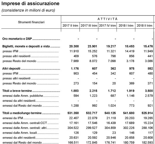 Ciò anche in quanto le assicurazioni sono state venditrici nette di titoli pubblici nel corso del trimestre (-1,3 mld), probabilmente in ragione di un diversa regolazione che impone loro una gestione maggiormente prudenziale del rischio. Tanto è vero che gli acquisti di titoli a lungo emessi dal resto del mondo sono aumentati.