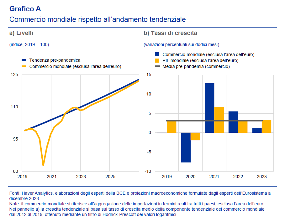 mondiale (esclusa l’area dell’euro) al 3,0 per cento nel 2024 (in aumento rispetto all’1,1 per cento del 2023), sostanzialmente in linea con l’elasticità unitaria a lungo termine del commercio mondiale rispetto al PIL mondiale”.