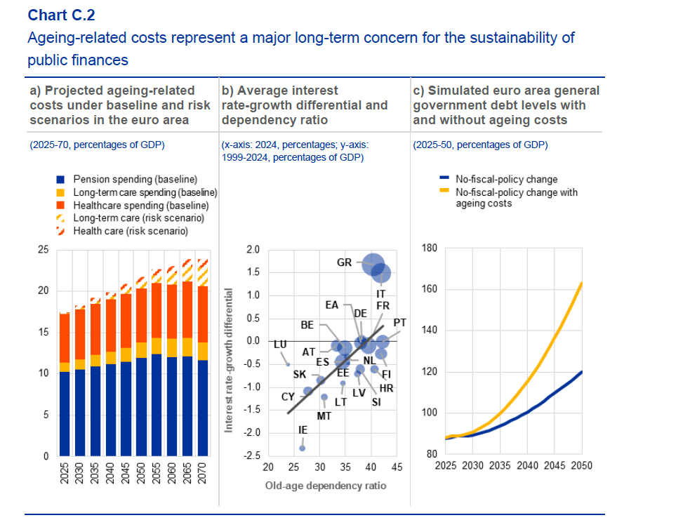 Anche sul versante fiscale, le prospettive non sono rassicuranti. Una popolazione sempre più anziana richiede maggiori spese per il welfare a fronte di una base di tassazione che si restringe e che dovrebbe sostenerla. Un bel dilemma per governi già alle prese con la sofferenza fiscale.