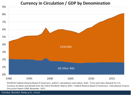 Prima della crisi, nota il nostro osservatore, la quantità di banconote in circolazione era pari a 762 miliardi di dollari, circa il 5,2% del pil (quarto trimestre 2007). Nel 2018 (quarto trimestre) la quantità di dollari cash è arrivata a 1.600 miliardi, pari al 7,8% del pil, accelerandosi una tendenza che si poteva osservare già dal 1990.