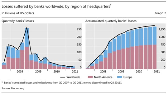 Notate che gli 856 miliardi di dollari di esposizione bancarie europea verso gli Usa del 2002 diventano più di due trilioni nel 2007. Quest’ultimo grafico misura le perdite delle banche Usa e di quelle europee.