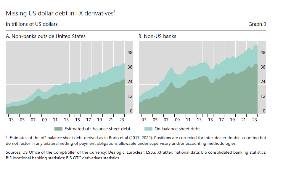 Ci sono molti più dollari in giro di quello che sembra, ci dice la Bis nella sua ultima quarterly review, spiegando che la pratica di “nascondere” valuta americana fuori bilancio, sia da parte delle non banche fuori dagli Usa che da parte delle banche, sempre fuori dagli Usa, è una conseguenza tecnica della dominanza della denominazione in dollari del mercato dei derivati in valuta. Non serve qui entrare nel tecnico. Basta osservare che parliamo di una bazzecola da oltre 60 trilioni di dollari di debiti fuori bilancio sparsi in giro per il mondo. Con l’avvertenza che saranno pure “missing”, come scrive la Banca. Ma esistono e per giunta crescono col tempo. Al momento giusto ce ne accorgeremo.