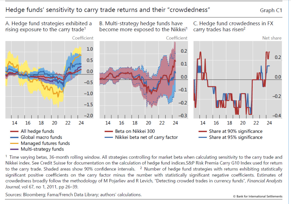 La Banca di Basilea, nota, a tal proposito, che l’esposizione di queste entità al carry trade è notevolmente cresciuta in questi anni, insieme all’esposizione al mercato azionario giapponese e al mercato valutario (FX). Detto in soldoni, questi fondi avevano trovato un bengodi nello yen a tassi negativi, che vedeva costantemente erodere il proprio valore, e adesso bisognerà vedere come reagiranno alla nuova aria che spira da Tokyo.