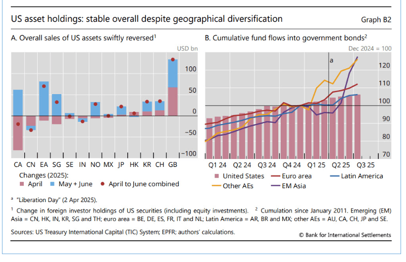 Se osservate il pannello di destra noterete che, come scrive la Banca, “nel secondo trimestre del 2025, i flussi verso i fondi obbligazionari sovrani destinati ai paesi dell’area dell’euro e ad altre economie avanzate hanno superato quelli destinati agli Stati Uniti”. Ma come si vede dagli istogrammi, anche i flussi verso gli Usa rimangono abbondanti. Il mercato del dollaro, insomma, è ampiamente supportato dal credito degli investitori.
