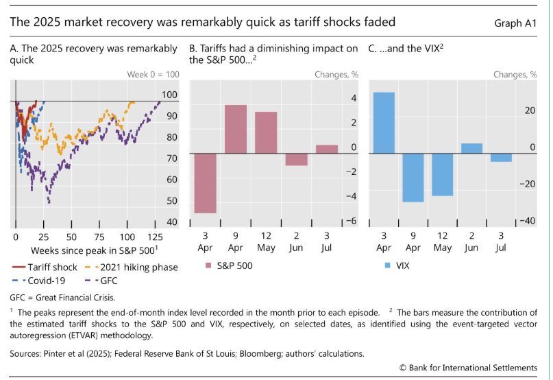 La ripresa dei mercati dopo lo shock di aprile dell’annuncio delle tariffe è stato assai più rapido di quella osservata in occasioni di altri shock. Osservate come l’asse orizzontale si contragga sempre di più, nel tempo. Che significa?