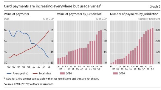 In ogni caso, la voglia di smaterializzare i pagamenti è intensa almeno quanto quella di affidarsi alle vecchie banconote. Il valore dei pagamenti elettronici, rispetto al pil, oscilla molto, dal 10% in Germania, Giappone e Messico, a oltre il 40% in Corea del Sud, l’Arabia Saudita e il Regno Unito. “Le persone hanno più carte elettroniche e le usano più spesso”, nota la Bis. E al tempo stesso le usano più di frequente. Il numero delle transazioni, infatti, è cresciuto parecchio nell’ultimo quindicennio,, ovviamente con differenza profonde di paese in paese In Australia, Svezia, Corea e Usa, in media una persona una carta di pagamento 300 volte l’anno. In India e Messico appena 25. A tale frequenza di utilizzo si è associato un calo del valore relativo del pagamento, da circa 60 dollari a 40.