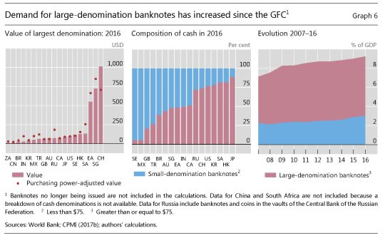 E anche qui i primato nell’uso delle banconote di grosso taglio spetta al Giappone e ha conosciuto un notevole incremento all’indomani della crisi, quindi dal 2007 in poi.